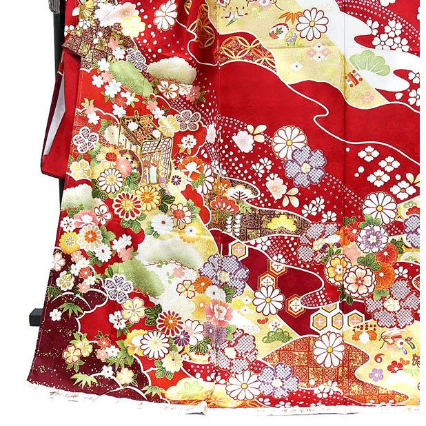 - レディース > 着物・浴衣 > 振袖 フルセット6点特価サイズM総絞り御所車銀駒刺繍 正絹 売り切り終了 セール 吉澤友禅 正絹振袖 手縫い仕立付き 赤 御所車 金彩 f-794 正絹
