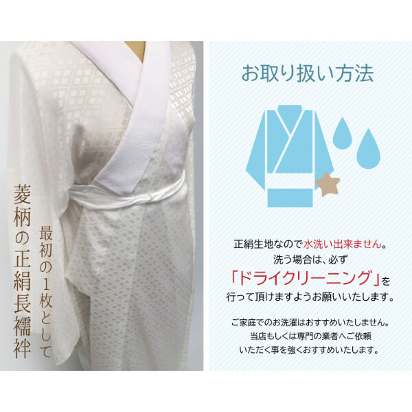 - レディース > 着物・浴衣 > Y2232◇美品 単衣 正絹 清次郎落款 袖無双 刺繡衿・居敷当付 長襦袢 着物 受注生産 Asumo 正絹長襦袢 女性用 菱の地紋入り 袖無双 正絹居敷当て