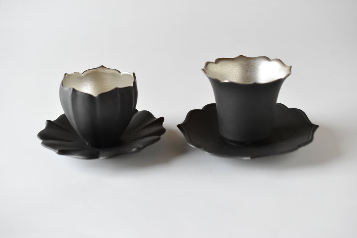 - 食器・キッチン用品 > グラス・カップ・酒器 > 東一仁 黒稜花銀彩(五葉)カップ・ソーサー 2セット 作家もの 器 東一仁 黒稜花銀彩(五葉)カップ・ソーサー 2セット 作家もの 器