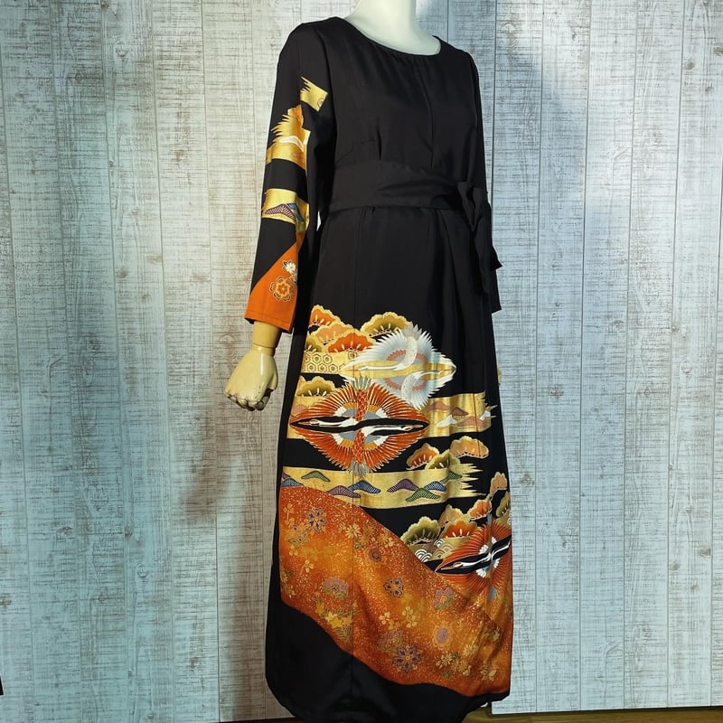 | メーカー | 着物リメイク 黒留袖 ロングワンピースM〜L オレンジゴールド 金駒刺繍 着物リメイク |